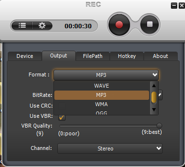 These options will help you set up proper parameters for recording the sound and getting a proper output file. The device menu helps you select the device through which you want to start recording the audio. Here you can also set the volume for your audio recorder. Then there is the output menu that will help you set up the output format of the recorded audio. You can set the format in MP3, wav, Wave, ogg, wmv. Here you can also make the changes in bit rate, vbr quality and channel. After this you will get the file path menu that helps you specify the folder where you will be storing your recorded audios. The default name of the recorded audio is kept “audiorecorder” you can change this and give the name according to your choice.
