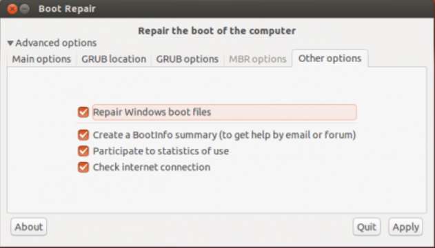 We mentioned that you can use Boot-Repair for fixing GRUB. For those who don’t know what that is, it’s the bootloader which Linux distributions and some other alternative operating systems use. Officially installation of this free boot repair utility is available only for Ubuntu and you’ll have to run it off of Ubuntu’s Live CD, if we’re talking about repair. Here’s a few pointers to help you get started.