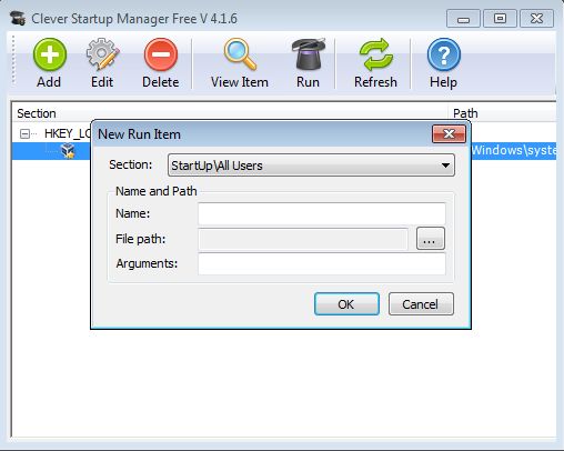By selecting View Item or Run you can also just view the information about the selected startup entry or run it, which is useful when you’re not sure just what a certain startup entry will do. When you click Add, the New Run Item window will come up with which you can add a new application to windows startup. You can add it either to Windows folder or to the registry. When you’re done, click OK and it’s gonna be added.