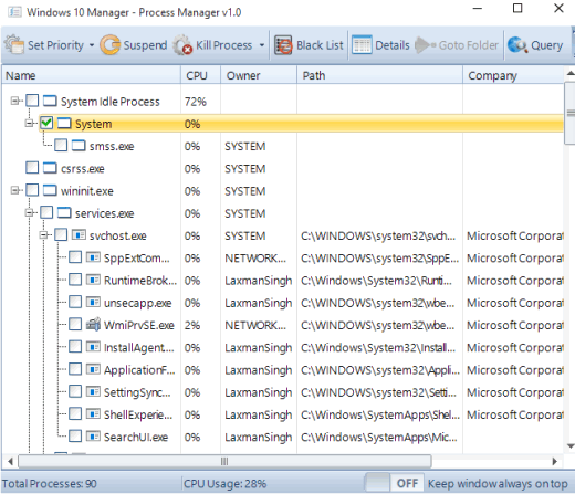 - Process Manager: This tool shows the list of all active (or running) processes and their threads. It is also helpful to check CPU usage taken by each individual process. From the list, you can also select multiple processors to kill them together. Apart from this, you also have options to set the priority (high, low, normal, etc.) of processes and suspend the selected processes.