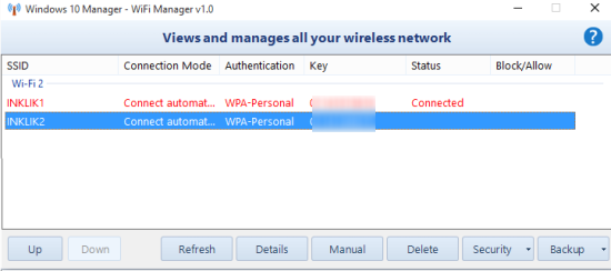 - Wi-Fi Manager: When you have to block a Wi-Fi network, delete any network from the list, view network key, and get details of a Wi-Fi network, you can use this tool. Option to backup profile settings of selected network is also available in this tool.