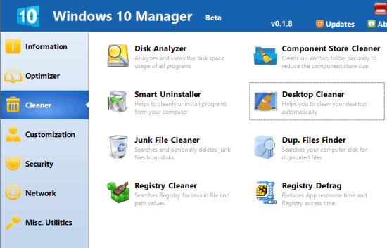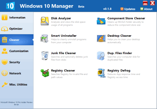 After this, you can open the main interface to use the tools. There are total 7 different categories available under which multiple tools are present to optimize, tweak, and clean your Windows 10 PC. These categories are: Cleaner, Optimizer, Network, Security, Information, Customization, and Misc. Utilities. Have a look at these categories and important tools available under each individual category: