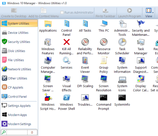 - Windows Utilities: This is really handy when you have to access any built-in utility of your Windows 10 PC. For example, you can explore and access Control Panel utilities, Network, File, Disk, Security, Device Utilities, etc.