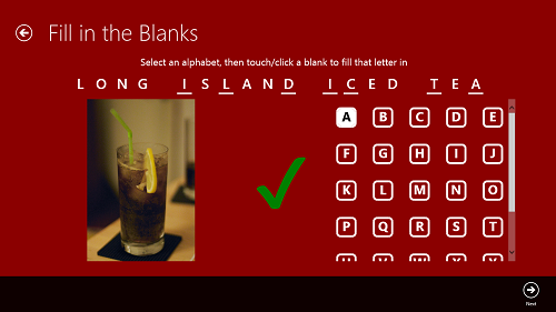 Once you have answered a question in the quiz, you can proceed to the next question by clicking on the Next button at the bottom right corner of the screen. This is all that you need to know about using the Cocktail Drinks app for your Windows 8 device.
