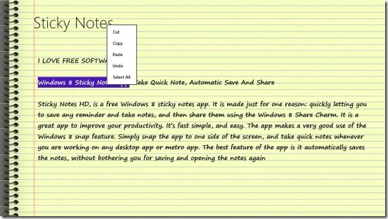 The app makes a really good use of Windows 8 snap feature and Windows 8 Share Charm. Even after snapping the app, the size of the fonts remains almost the same. And, the app automatically formats the text (note), that is, it breaks a long line and wraps them accordingly; so that you can easily see the notes, even when snapped. Also, you can use the Windows 8 share charm to share the note through mail or any other metro app installed in Windows 8 device.