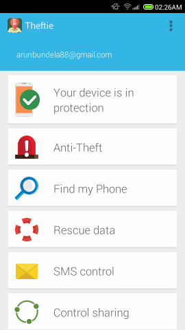 After this, on the main interface, Theftie for Android will show that your device is protected. Also, most the options in the app were setup by following the steps mentioned above. If you like you can modify any of these options from the interface. Also, if you want, you can setup ‘control sharing’ which was not discussed above. This option allows other to control your device, and vice versa.