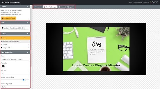 This is yet another simple and easy-to-use graphic generator that you use to create Featured images that can be downloaded in the PNG format as well as Exported in the JSON format.