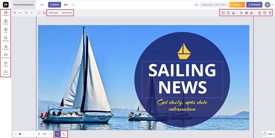 Click on an image that you like, to view it in full size. You can use the vertical side bar at the left of the screen to modify the Text, Images, Elements, Colors of the image and more. The toolbar at the top of the image helps you to change its Opacity, Border, Alignment, Shadow etc. as well as to flip the image.