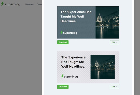 Next, upload an optional Graphic image and Brand Logo to help the website create a precise Featured Image. The graphic image may be something related to the content of the post that may help to make it stand out. Finally, click on ‘Auto Generate’ and Superblog will produce a range of Featured Images for you in a pop-up window. You can scroll up and down to view all the images. To Edit any image, click on the ‘Edit’ button and go ahead and modify the Title color, Background color, Background Pattern and more. Click on the ‘Download’ button below the image to save it in your local computer in the PNG format.