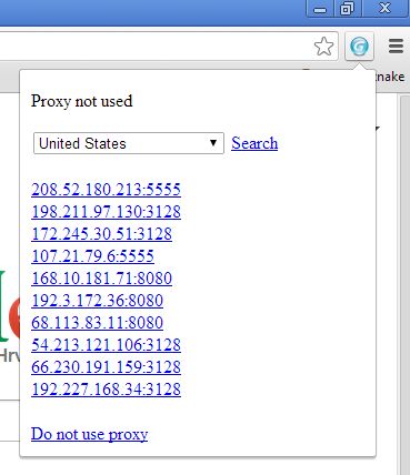 The only thing that you have to do in order to change your identity online and to access blocked content is to click on the GeoProxy extension icon in the top right corner. It’s gonna present you a list of proxies grouped by country. Let’s say for example that you want a website to think you’re from the United State. Just select United States from the list, click Search and you’ll be given a list of working proxy servers that you can use.