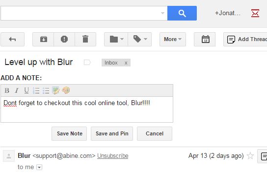This Evernote alternative is also surprisingly advanced. You get to annotate emails, create sticky notes in the inbox, notes can have due dates with reminders setup, pining is supported and more. To create a new note, just click on the “Add Thread Note” button, from the top toolbar. The extended toolbar shows up after you install the extension and give Notes for Gmail access to your account.