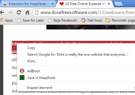 Extension for HeapNote is the most similar to Evernote, out of all the alternatives that I mentioned, but it still does things a bit differently. Online account on the HeapNote website needs to be registered and once you do that, it’s possible to easily clip text straight from the right click context menu within Chrome.