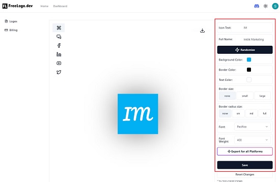 You must sign up for a free account to use this tool. Click on ‘New Logo’ and type two letters of your brand or company name in the ‘Icon Text’ field in the right-side panel as well as the full name of your business. Now, use the respective options in the panel to choose font, font size, background color, border color, text color and more and you will be able to visualize your logo in real-time. You can also click on ‘Randomize’ to allow FreeLogo.dev to randomly create different logo designs to choose from.