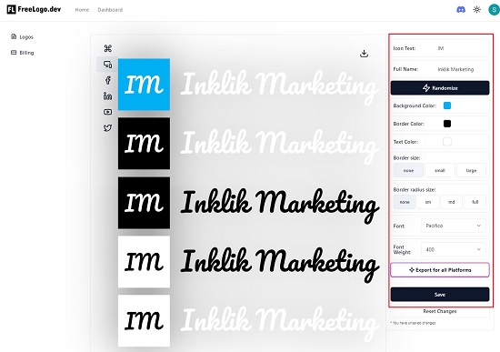 Once you are satisfied with the appearance of the logo, you can click on the button ‘Export for all platforms’ at the bottom of the panel and then click on ‘Download Free Icon’ to download the logos to your system in monochrome as well as color. You can subscribe to the Premium Version of FreeLogo.dev to gain access to more features that will also allow you to download your logo in all formats for social media platforms, blogs etc.