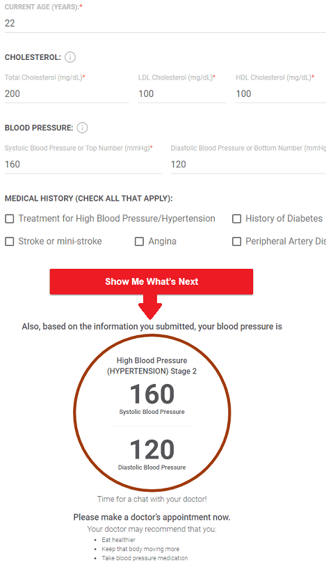 To use this tool, simply use the above link to land on its homepage. After that, fill out the details that it asks. Next, hit the “Show me What’s Next” button. It will process the data that you have entered and will show you the result of your blood pressure evaluation. You can analyze the result and then see a doctor if necessary.