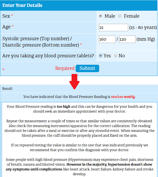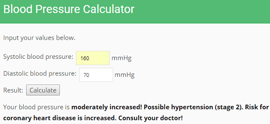 The websites below ask for parameters like age, gender, Diastolic Blood Pressure and Systolic blood pressure. After that, it evaluates this data and shows you the result. Using the result, you can analyze blood pressure level and even go through the further tips that some of these websites show you. However, I will personally recommend you to see a doctor as soon as possible if you find your BP to be high or too low.