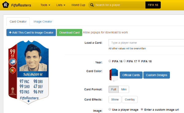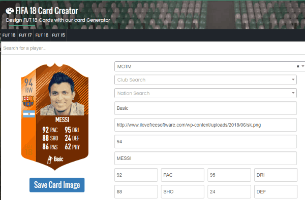 FIFA 18 Custom Card (by Futwiz) is another free FIFA card maker that can help you create custom player cards online. This one also lets you create cards for different FIFA seasons along with the World Cup. It allows you to easily search for existing players and then customize their cards. Apart from that, you can start from scratch and create a player card with your own image and stats. You can manually enter the player’s name, nationality, set the position, rating, chemistry style, etc. It also allows you to choose from tons of card types like Gold Non Rare, Hero, Bronze Non Rare, European MOTM, etc.