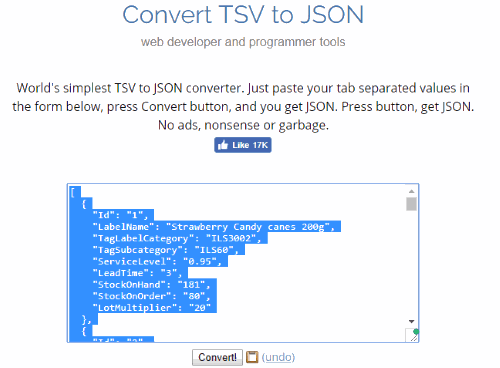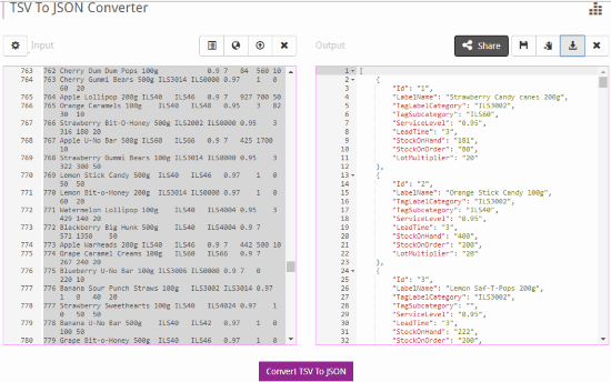 If you want a very simple online TSV to JSON converter, then you should definitely try this website. It lets you paste the TSV data into a box and then it will convert TSV data to JSON in just a single click. Once the output JSON data is generated, you can copy that data to clipboard and then manually save that data as JSON file. You can also edit the input data and output JSON content but can’t preview both data side by side.