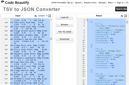 Code Beautify is a good competitor to other online TSV to JSON converters on this list. It has many interesting features. You can create a new TSV file and then convert it to JSON, edit TSV file before converting it to JSON file, and edit the output content before saving it as JSON file to PC. Input and output content is visible side by side for preview which is another good feature of this website.