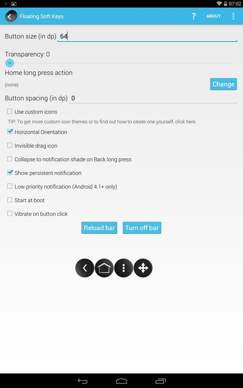 Notice the positioning button next to the usual three (back, home and settings). Tap on that button allows you to drag the entire toolbar anywhere on the screen. It can be minimized to the notification tray and accessed from there. Button spacing, transparency and size can be tweaked to your hearts desire. As the title of this app suggests, root is required for it to work.