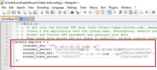 Step 2: Open the “config.js” file with any text editor and fill out the Twitter API keys and tokens (line 7 to 10).