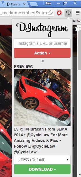 What does work is download of individual images from Instagram from the top right corner drop down window. While you have the image you want to download open in a tab, left click on the DInstagram icon and the download window with image preview will pop-up. At the bottom it’s possible to select different formats for the images that you download, JPEG, GIF or PNG.