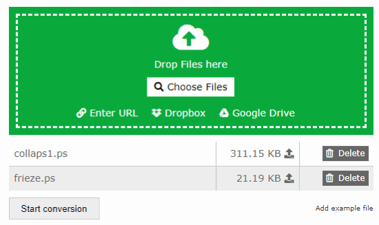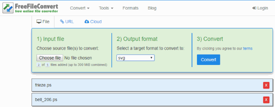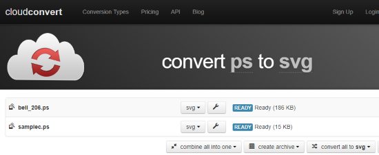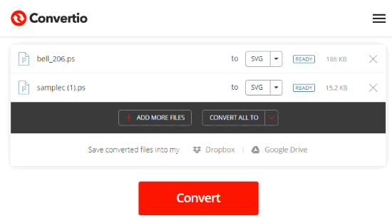 CloudConvert is a free PS to SVG converter. Apart from this, you can convert archive, audio, cad, video, image, presentation, document, eBook, spreadsheet, vector, font, and vector. Also, there are other ways to download files, for example, computer, Dropbox, Google Drive, URL, One Drive, and Box. You can multiple files. And the converter let you select different output formats for each input file.