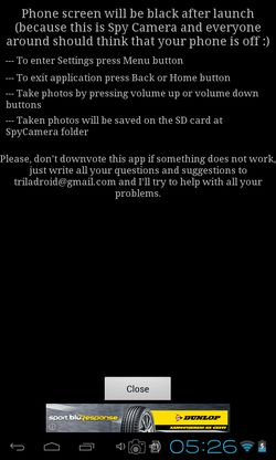 Instructions on how to take photos can be seen only the first time that you run the app. After that when you run this secret camera app, the screen goes dark. You can set an image for the background by clicking on the settings button at the black screen. Use volume keys to take photos.