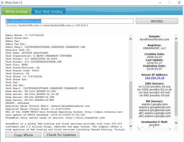WHOIS Tools is a whois lookup software for Windows 10 which lacks the kind of advanced features found in the two previously mentioned applications. It’s more simplistic, but at the same time it still offers a lot of useful information.