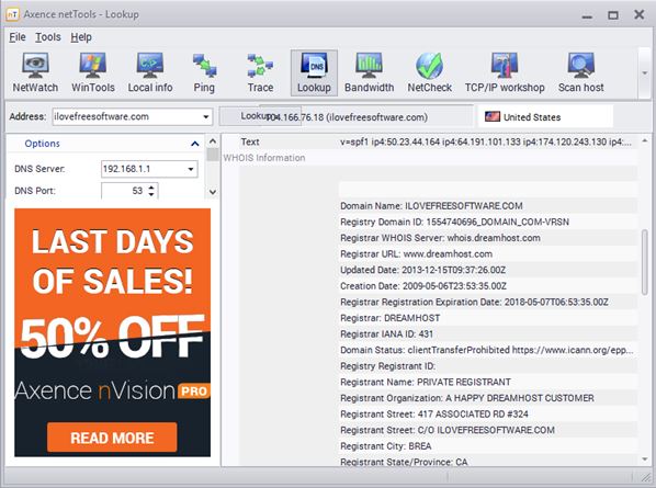 Here there is no batch whois checks. Only info of individual domains can be looked up. Great thing about Axence netTools is that it doesn’t just stop at checking whois info. It also scans for things like DNS servers, IP addresses, mail server info and more. Just type in the domain name in the left sidebar and click on the “Lookup” button. Info is again given in a text box on the right.