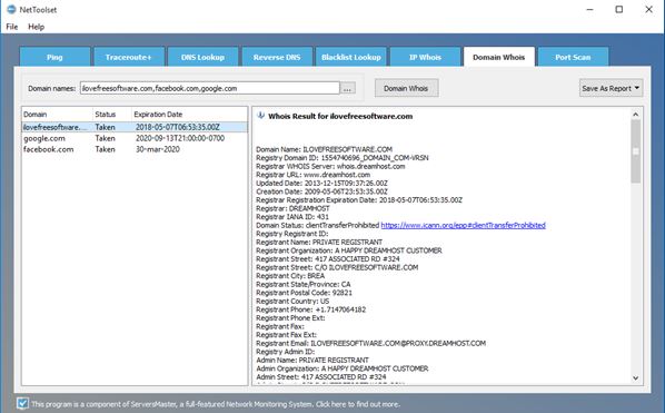 This whois checker for Windows 10 is also advanced. It too, just like WhoisThisDomain, will let you check whois info of multiple domains at once. Not only that, but it also lets you import a list of domains from files all at once using TXT documents. Adding domains to the list is of course also possible manually, by typing them in, or via copy-paste. When domains for whois lookup are loaded, click on the “Domain Whois” button to start the search. Results are shown down below. Domain name in the left sidebar, while info about a selected domain on the right-hand side of the program interface. Other features include ping tester, traceroute tool, DNS lookup, reverse DNS, blacklist lookup, IP whois and port scanner.