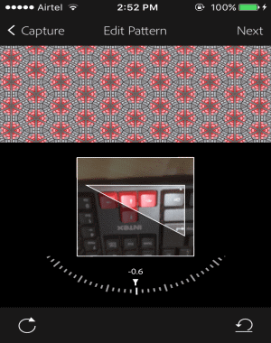 Step 2: Before you capture the photo, you can choose between 5 different pattern types and then see the live preview of how the pattern will look like on the camera screen. You can simply move your phone to change the pattern design as it will fetch and include all the colors of your surrounding visible on the camera screen automatically. When you find the perfect pattern preview, simply press the round button to capture a photo. Then the “Edit” screen will appear where you can change the pattern design by rotating the photo, zooming the photo, and also by cropping it.
