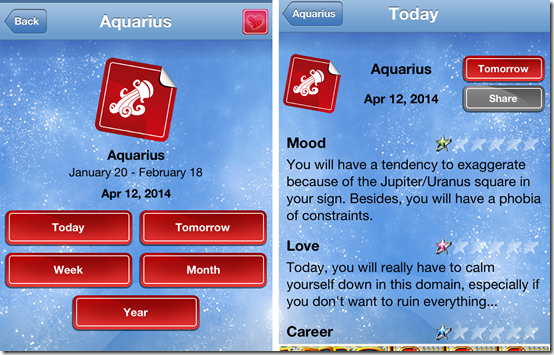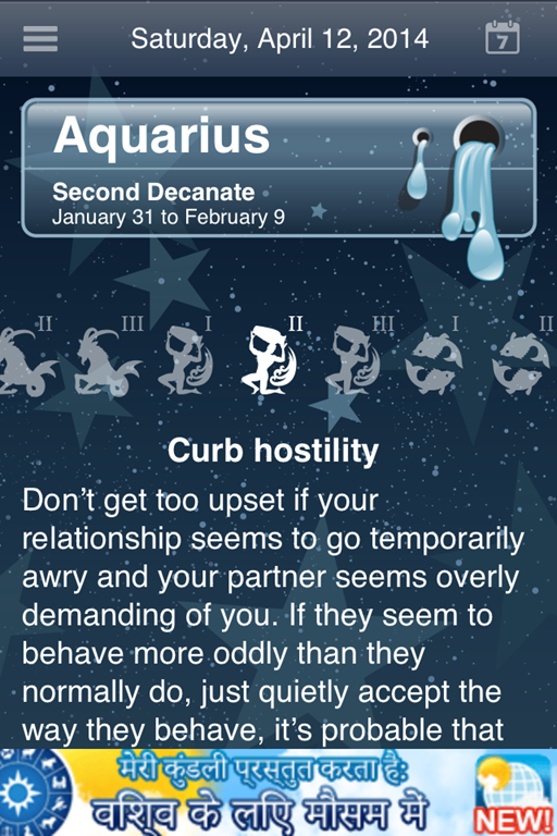 My Horoscope Free is a simple horoscope app for iPhone which only displays the horoscope; there is no compatibility report or any other such reports. You can choose to get horoscope for day before yesterday, yesterday, today, tomorrow, day after tomorrow, today+3 days, today+4 days, today+5 days, today+6 days, and today+7 days. The app also lets you read horoscopes for each zodiac signs on the basis of decanate.