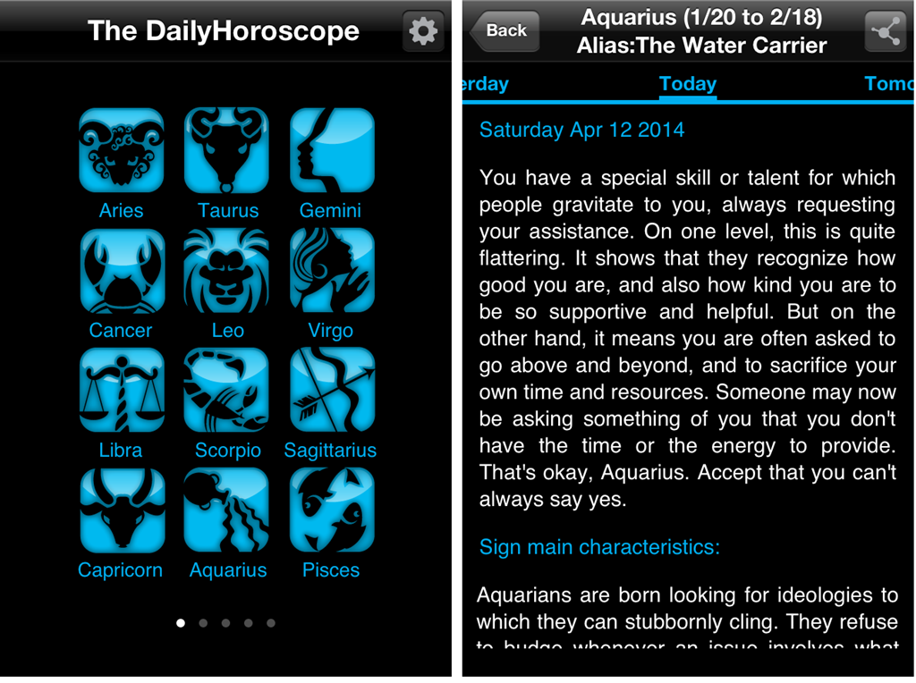 The first horoscope app for iPhone in this list is The DailyHoroscope. This app lets you check the following horoscopes: Daily Horoscope, Yearly Horoscope, Zodiac Compatibility, Chinese Yearly, and Druid Horoscope. The daily horoscope lets you check horoscope for yesterday, today, next day, and previous 5 days. In Yearly horoscope, you can check for current and previous year. The app lets you set the reminders for getting the horoscope for any particular zodiac sign. You can also share it via Facebook, copy to clipboard, and email.