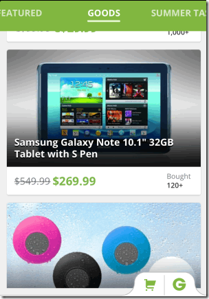 The first iPhone app to get discount coupons is Groupon. It is one of the most widely used iPhone apps to get discount coupons. The app has following categories for finding the discount coupons: Nearby, Featured, Goods, Summer Tastes, Top Sellers, and Gateaways. For any product in any category, the app displays the product name, photo, normal price, discount price, and number of persons who have availed the discount so far. You can tap on the product to check the availability, highlights of product, conditions for availing the deal, address and map location of store giving the deal, and detailed info about the deal. The app even lets you buy the product using the deal from within the app. All the deals available in the app can be shared by Facebook, Twitter, and email.