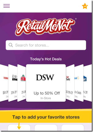 Fourth app for you to get discount coupons is RetailMeNot Coupons. The app displays the Today’s Hot Deals on the home screen of the app. You can swipe on the screen to navigate through all the deals. Each of the details contains the store name, deal offered, and whether its an online or in-store deal. Tap on any deal to get detailed info about it. You can mark any deal as Favorite and even share it with your friends. Besides this, you can also search deals on the basis of Nearby, Trending, and Categories. The Categories option has various categories for searching the preferred products like Accessories, Automotive, Beauty, Books, Clothing, etc. The app even lets you add your favorite stores to app so that you never miss any deals from them.