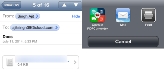 To convert mail attachments to PDF, open the mail and tap on the attachment. Select Open in PDF Converter option from the available list of options.