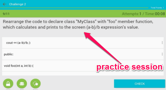 Step 4: The best way of learning any programming language is to practice. This app offers you various practice sessions for each topic that you browse. The practice session might include fill in the blanks, write input, write output, guess data type, etc.