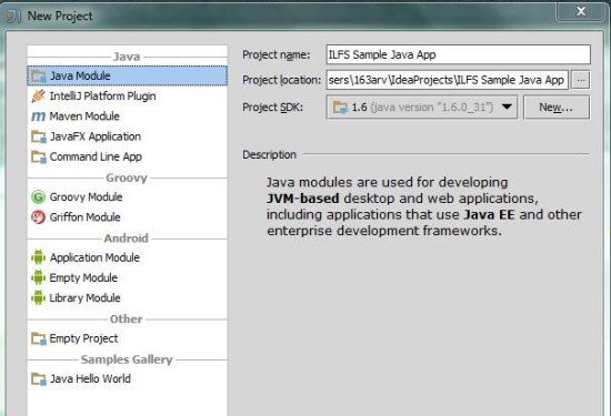 When you launch this free IDE on your Windows system, it will ask you to choose a platform (module) on which you want to work. Once you select the desired platform, you need to name your project, along with specifying an SDK to be used in the project. IntelliJ IDEA Community Edition does not include any SDK by default, which is necessary to develop applications. So if you don’t have any SDK installed on your system, download and install it before start writing code on IntelliJ IDEA Community Edition. Some platform also requires entering an application server and some other options (like content root, module file location, etc.) for which they recommend choosing the default values.