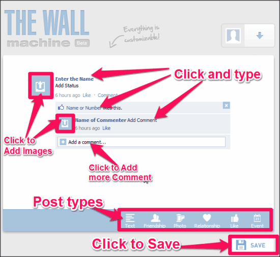 The Wall Machine is a free website to create fake Facebook wall post. It provides you the options to create fake text status, friendship, photos, relationship, event posts, etc. and add names of anyone you want. That’s not all, you can even create fake likes, and comments with these posts.
