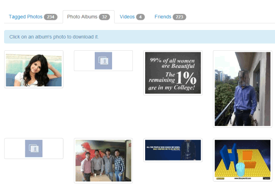 All tagged photos can be downloaded in a single zip file. But if you have to download your photo albums or your friend’s photo albums, then one album at a time can be downloaded. Click on any photo album to download it.