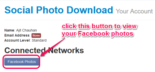 Step 3: This step will show some details related to your account, such as: your name, account level, and email address (if entered). A Facebook Photos button will also be visible to you, just like screenshot below.