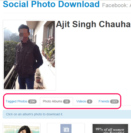 Social Photo Download is a handy online Facebook photo downloader that helps to download Facebook photos of your account. You can download your Facebook albums, tagged photos, friends albums, and their tagged photos. All this can be done with a few mouse .