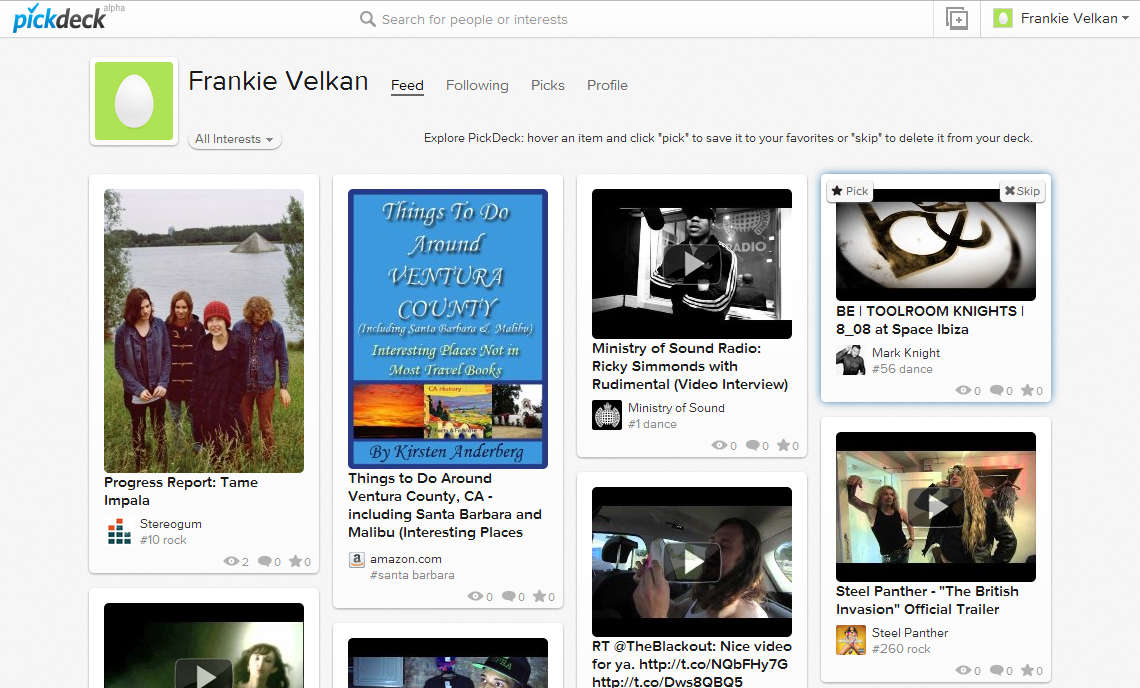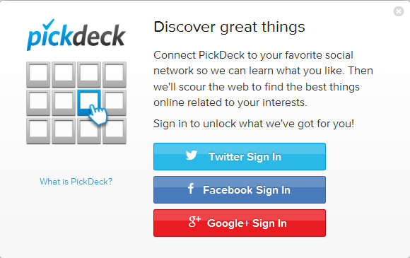 PickDeck is a free social network service which is gonna connect to your Twitter, Facebook or Google+ accounts, check what kind of things you like the most and then search the web in order to find content which is relevant to your interests. It’s gonna look for everything, photos, news, videos, music and post all of these things to your PickDeck Feed.