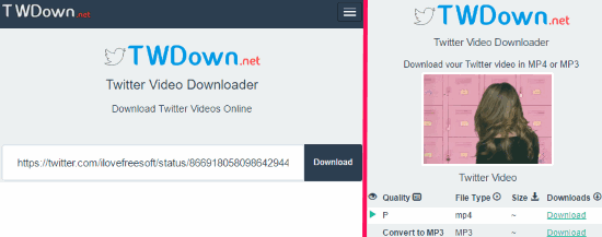 TWDown is a free online website to download Twitter gif and videos. It downloads Twitter GIF as video file. It can fetch the GIF from tweet URL and will convert it to a video file of MP4 format. There is no need to create any account; just go to the link provided above and then paste the tweet URL. After that, click on the “Download” button and you will see the GIF (not played) and the links to download it as MP4 and MP3 file. Click on them to download Twitter GIF as video and save it to your PC.