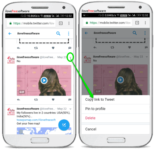 Method 1: You can copy the link of the tweet with the GIF you want to download from the Twitter mobile website. Open it on any Android browser and then tap on the “small down arrow” right next to any tweet or GIF tweet. This will bring forth some options, you have to choose “Copy link to Tweet” option to copy the Tweet URL to clipboard.