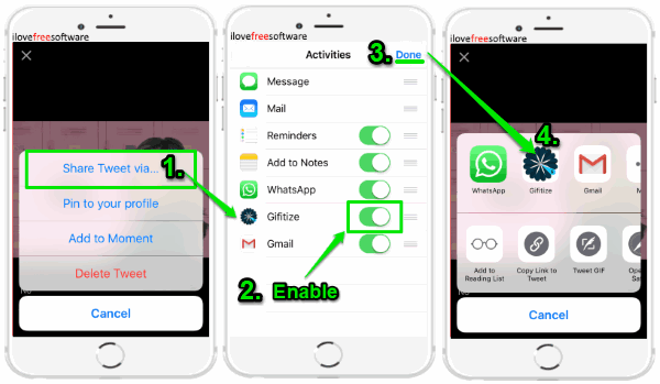 Open Twitter iPhone app and start browsing your feed or go to a Twitter handle to download a specific GIF file. When you see the GIF on Twitter you want to download, tap on it to view the gif, and then share the tweet via Gifitize. Do note that when you do it for the first time, you will have to enable the “Gifitize” option in the Activities, as shown below. In order to do this, tap on the “More” option when you see a list of apps to which you can share the tweet and then enable the “Gifitize” option.