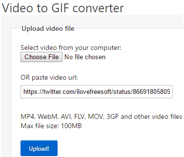EZGif is actually an online video to gif converter. When you go to this website using the link I mentioned above, you can directly paste the URL of the tweet in “paste video url” box. Then click on “Upload!” button. It will immediately extract the gif from the tweet, and will show that as a video. You can then perform the edits that I mentioned above. For example, if you don’t want to download entire gif, but only a part of the gif, then you can specify start and end time. You can also modify frame rate. Once done, just click on “Convert to gif” button.