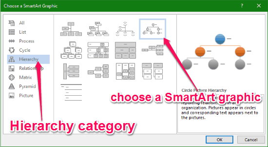 Step 2: Simply, click on the “SmartArt” option and a popup window will appear where you will see various categories for SmartArt graphics like List, Process, Cycle, Hierarchy, Matrix, etc. Now, select the “Hierarchy” category and all the associated SmartArt graphics will be visible like Circle Picture Hierarchy, Half Circle Organization Chart, Labeled Hierarchy, Lined List, and more.