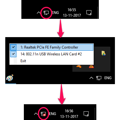 Above you can see how NetSwitch freeware works to disable WiFi, Ethernet in one click. You can now enable disable any network interface on your PC in one go. You will not have to do that by a long process, that is by entering into the Network and Sharing Center of Control Panel.